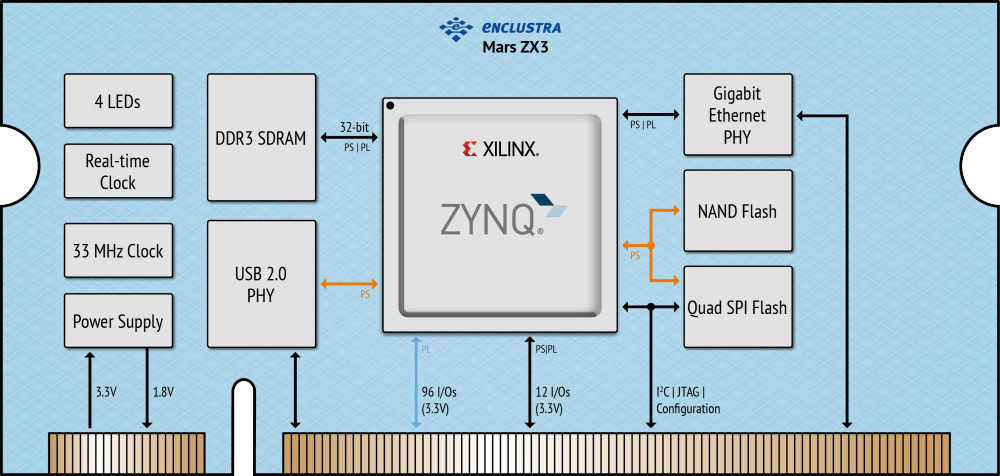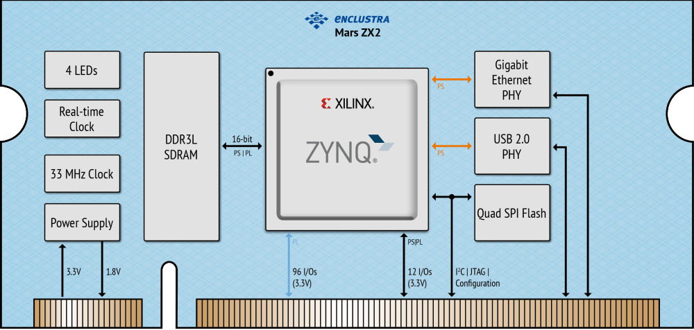 Mars ZX2 核心板将 AMD Zynq™ 7010/7020 SoC 结合高速 DDR3L SDRAM、四 SPI 闪存、千兆以太网 PHY 和 RTC,构成了一个完整而强大的嵌入式处理系统。