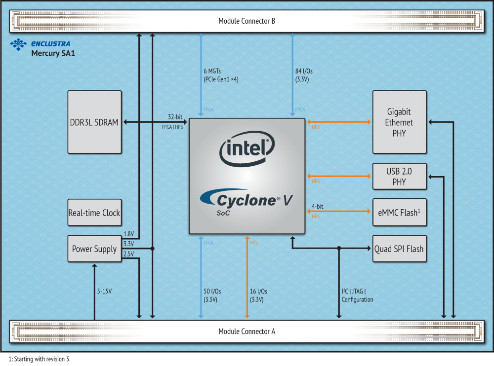 Mercury+ SA2 片上系统 (SoC) 模块将基于英特尔 Cyclone V ARM 处理器的 SoC FPGA 与快速 DDR3L SDRAM、四 SPI 闪存、千兆以太网 PHY、双快速以太网 PHY 和 RTC 相结合,从而形成了一个高性能的嵌入式处理解决方案,将 CPU 系统的灵活性与 FPGA 原始的实时并行处理能力相结合。