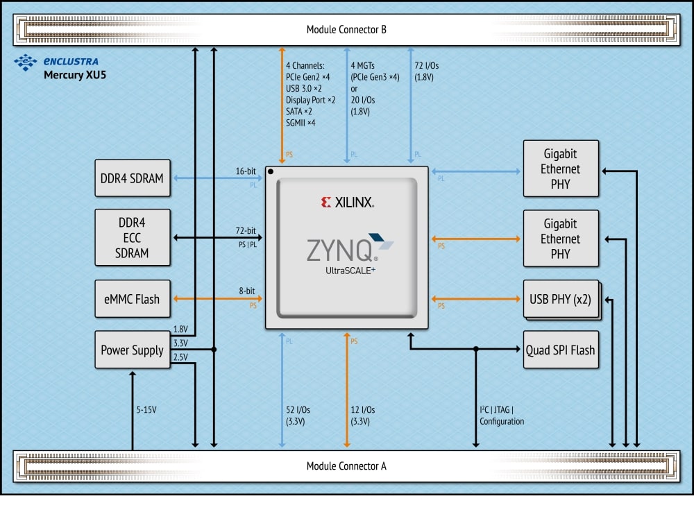 Mercury XU5 核心板将 AMD Zynq™ UltraScale+™ MPSoC 系列器件与高速 DDR4 ECC SDRAM、eMMC flash、QSPI flash、双千兆以太网 PHY 和双 USB 3.0 相结合,形成了一个完整而强大的嵌入式处理系统。