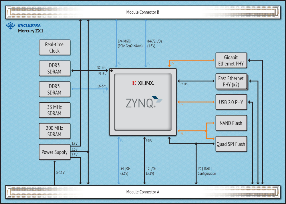 Mercury ZX1 核心板将 AMD Zynq™ 7000 系列SoC 器件结合高速 DDR3 SDRAM、NAND flash、QSPI flash、千兆以太网 PHY、2×10/100Mbs 以太网 PHY 和 RTC,构成了一个完整而强大的嵌入式处理系统。